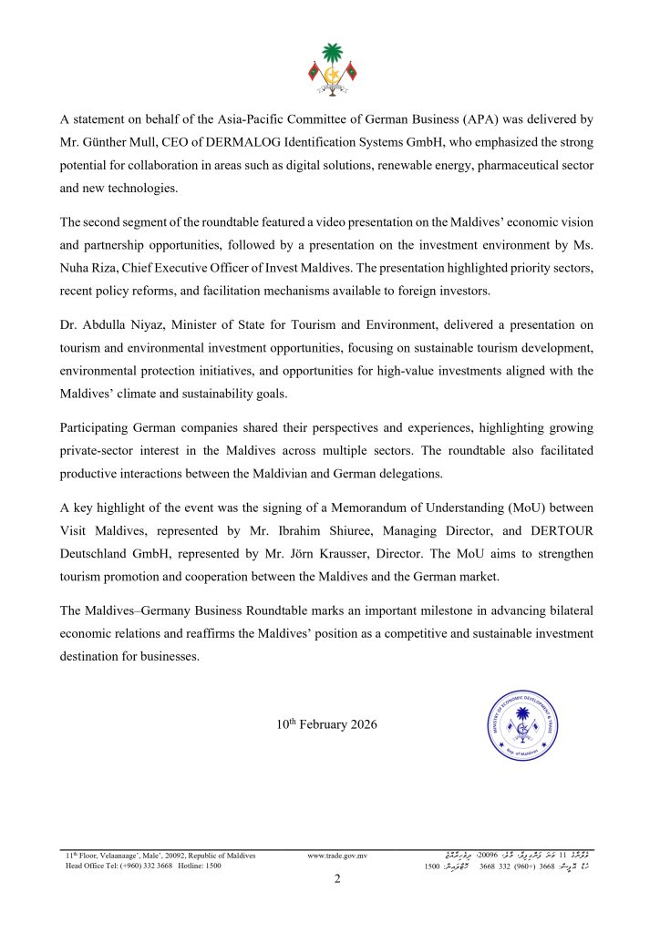 ނޫސްބަޔާން: ދިވެހިރާއްޖެއާއި ޖަރުމަންވިލާތުގެ އިޤްޠިޞާދީ ގުޅުން ބަދަހިކުރުމަށް “ދަ މޯލްޑިވްސް-ޖާމަނީ ބިޒްނަސް ރައުންޑްޓޭބަލް” ބާއްވައިފި
