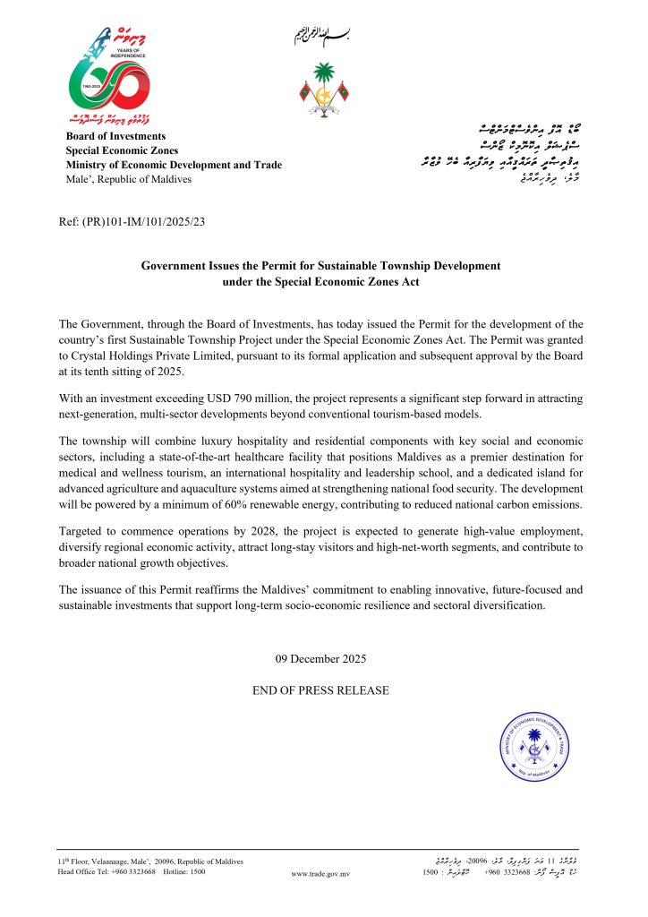 Press Release: Government Issues the Permit for Sustainable Township Development under the Special Economic Zones Act