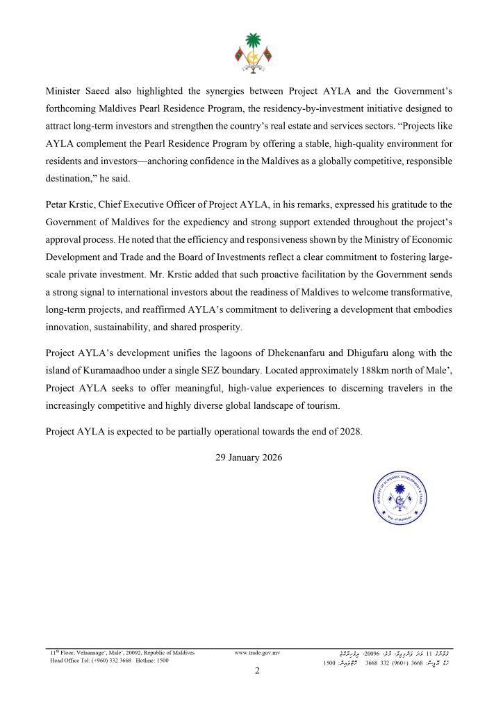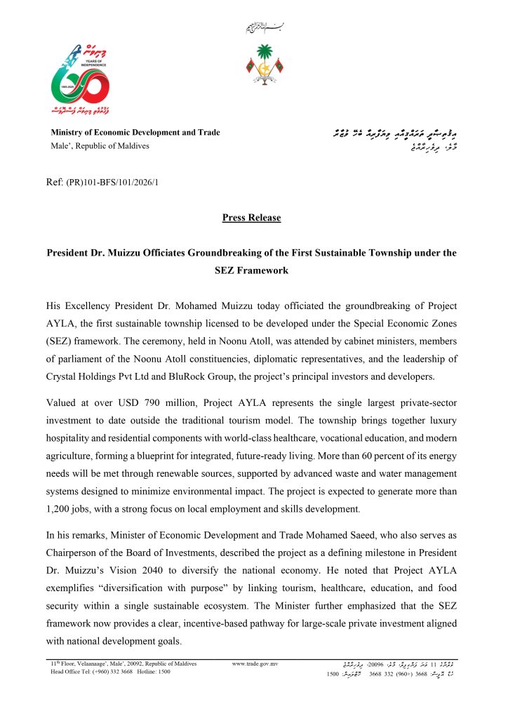 Press Release: President Dr. Muizzu Officiates Groundbreaking of the First Sustainable Township under the SEZ Framework