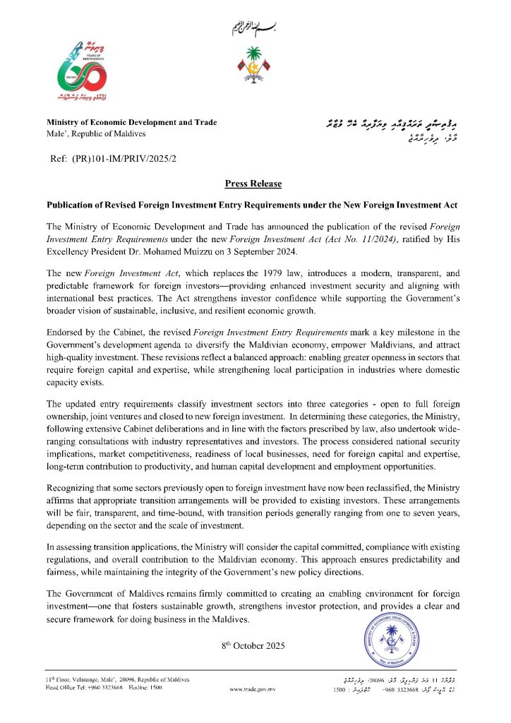 Press Release: Publication of Revised Foreign Investment Entry Requirements under the New Foreign Investment Act